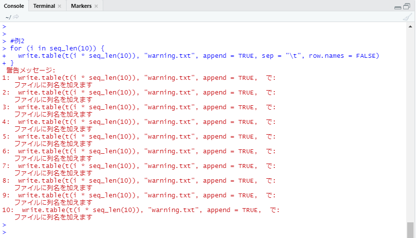 検定結果を保存するには次のように検定結果を保存したデータフレームをwrite.csv等で出力します。
